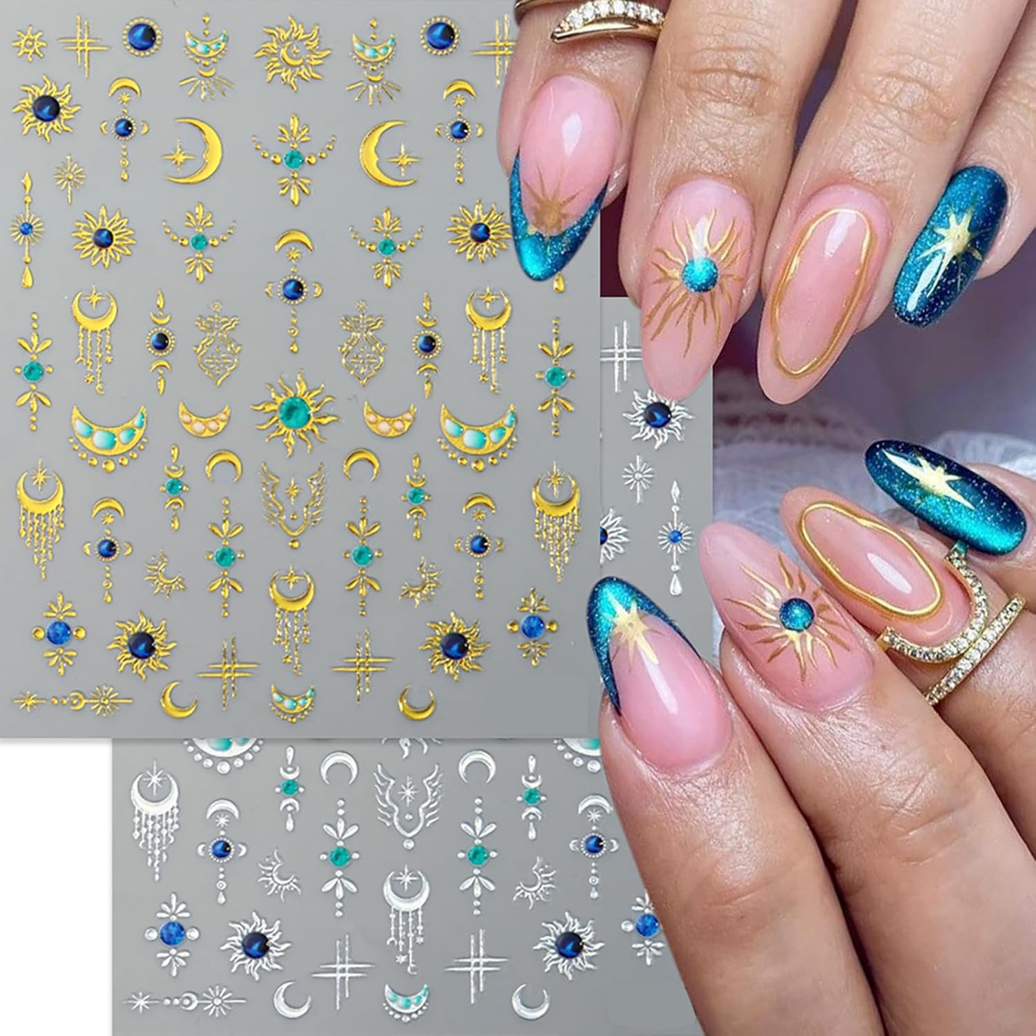 - 【Premium Nail Sticker Set with Diverse Designs】Includes 4 sheets of high-quality metal bohemian nail stickers featuring popular patterns like star, sun, flower, moon and glitter designs. Each sticker measures 9.5 x 8 cm (3.74 x 3.15 inches), ideal for natural and artificial nails
