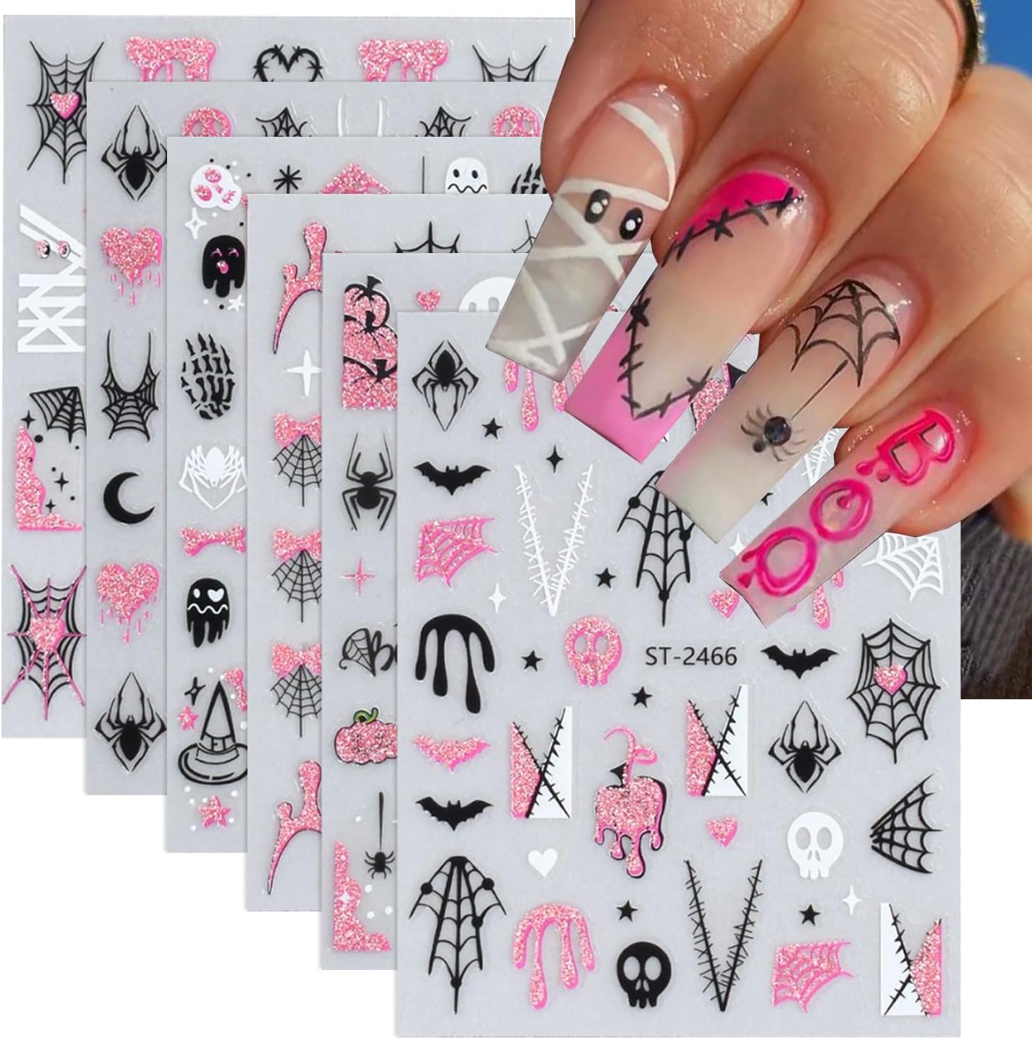 6 Sheets Halloween Nail Art Stickers Glitter Pink Nail Stickers Spider Web Nail Decals Pumpkin Line French Tips Heart Design Ghost Nail Sticker for Nail Art for Women DIY Holiday Manicure Supplies