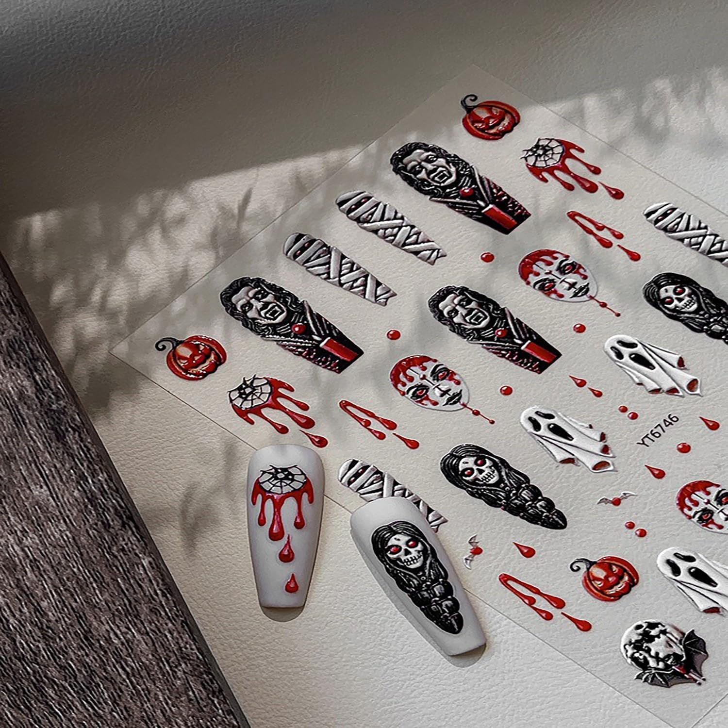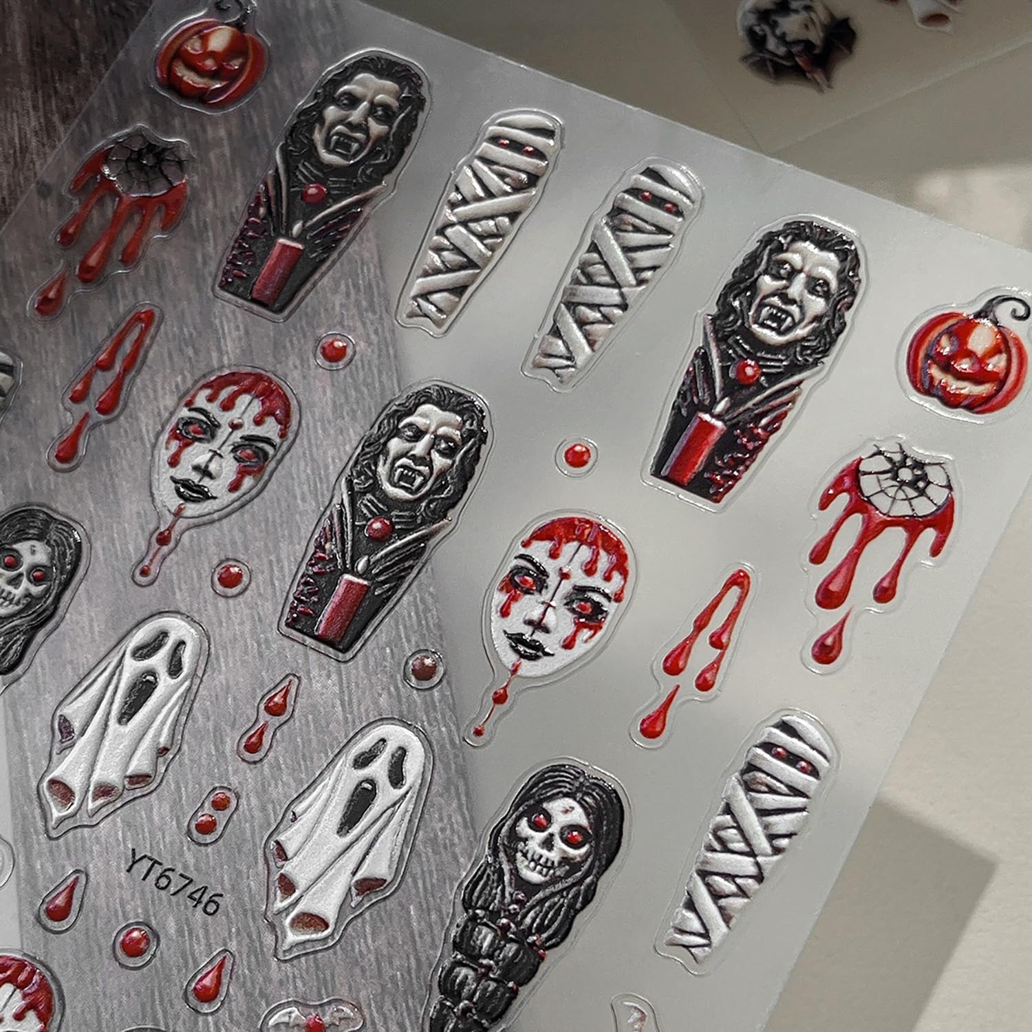 Halloween Ghost Nail Stickers 3D Embossed Stickers for Nails Spooky Nail Decals with Mummy Blood Drop Pumpkin Designs DIY Self Adhesive Nails Art Decoration