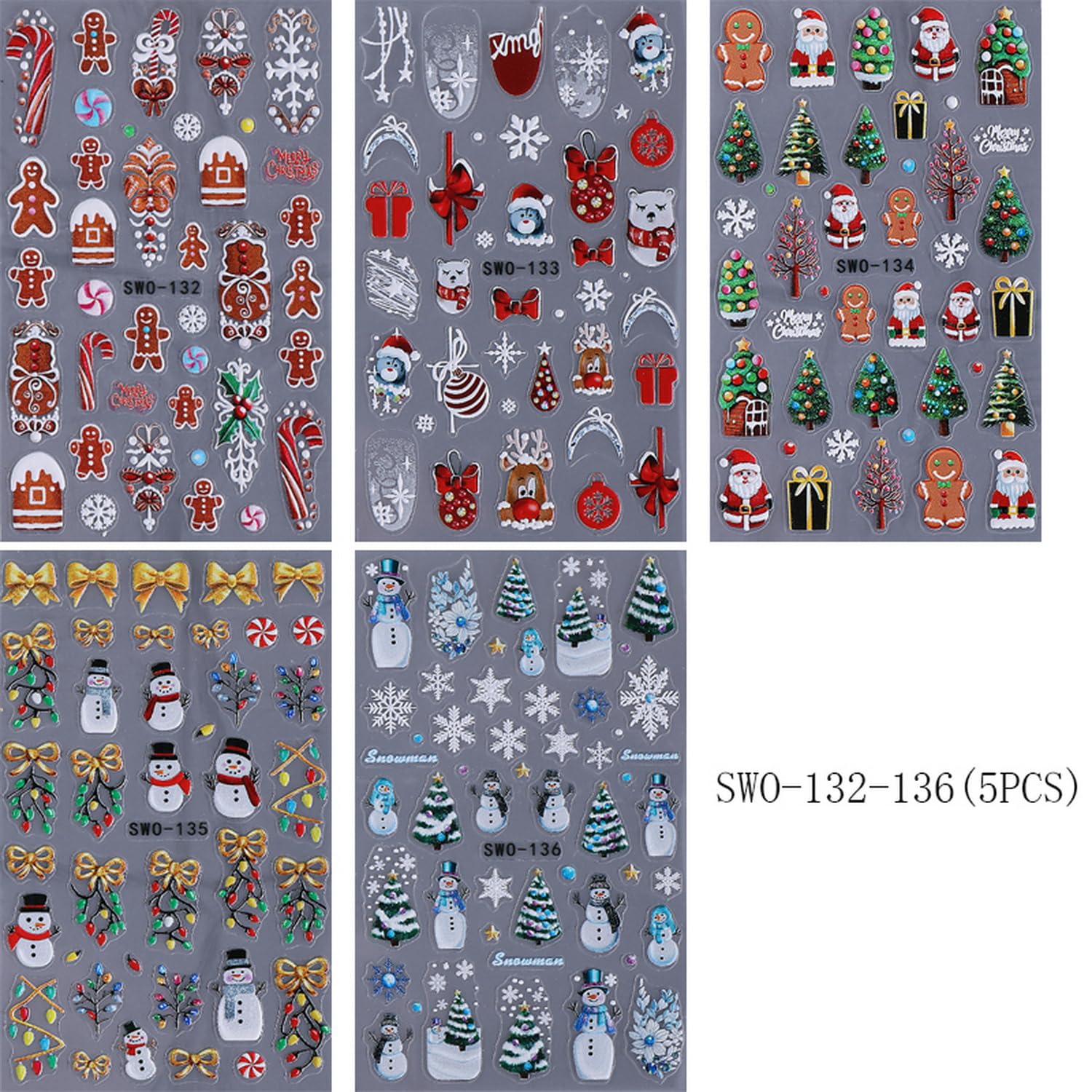 5 Sheets Christmas Nail Art Sticker Snowman Elk Christmas Tree Gingerbread Man Design Winter Xmas Self-Adhesive Snowflake Santa Claus Nail Stickers Decals for Nails Supplies Christmas Nail Decoration