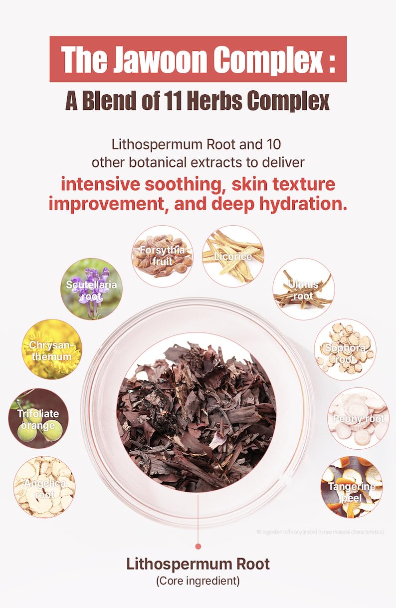 - Jawoon complex herbal blend: Infused with a traditional Korean botanical mix including Lithospermum root to help comfort and care for sensitive skin.